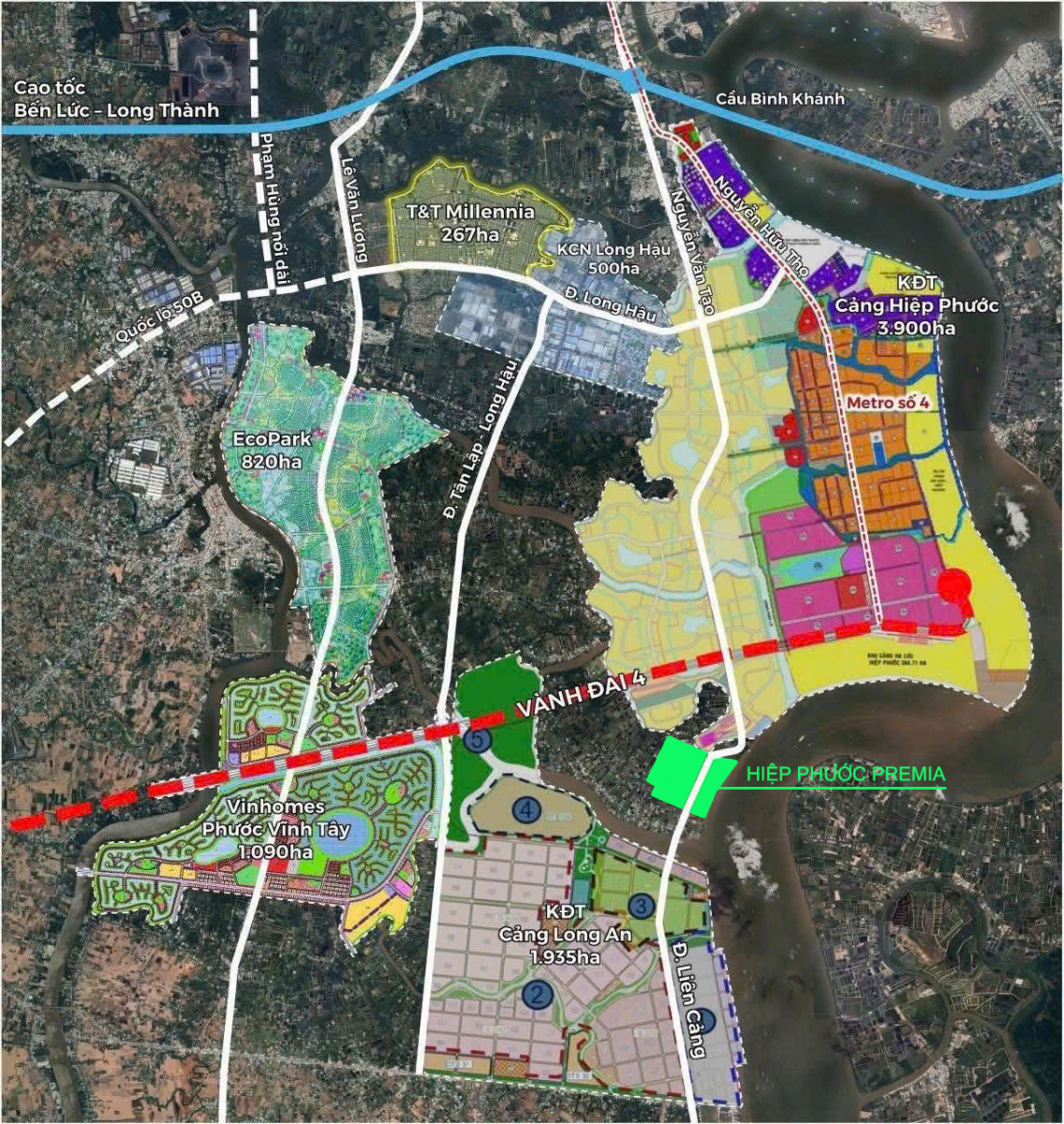 Phía nam dự án Hiệp Phước Premia là khu đô thị Cảng quốc tế Long An có quy mô 1.935 hecta. Khách hàng chỉ mất 5 phút để kết nối khu vực này qua đường Liên Cảng. Phía Tây Bắc và Đông Bắc của dự án là 2 khu đô thị Vinhomes Phước Vĩnh Tây có quy mô 1.090 hecta và khu đô thị Ecopark với quy mô 820 hecta. Phía Bắc là khu công nghiệp Long Hậu có quy mô 500 hecta và khu đô thị T&T Millennia có quy mô 267 hecta và hiện đang được chào bán ra thị trường với giá 5.5 tỷ/căn - 6.5 tỷ/căn cho nhà phố liên kế, từ 6.8 tỷ/căn - 8.5 tỷ/căn cho Shophouse.