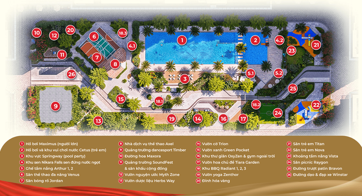 Diện tích hơn 26.000m2 được bố trí làm tiện ích: Công viên trung tâm 5.500m2, Hồ bơi đạt chuẩn Olympic 750m2, sân bóng đá, sân Pickle ball, khu vui chơi trẻ em. Không gian xanh len lỏi khắp khuôn viên dự án